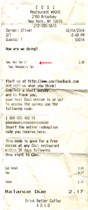 - As far as product descriptions go, you’re doing fine, Cosi Sandwich Shop! When Todd dropped in to Cosi for some “between shows” raspberry tea, he didn’t expect to walk out of there with a receipt so museum-worthy. Look at how Todd’s one cup of raspberry tea is described “Tea, Hot Tea GT, Tea, Raspberry Tea.” Pretty thorough and coincidental, since Todd describes his comedy as “Comedy, Funny Comedy GT, Comedy, Raspberry Comedy.”